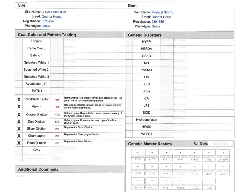 HOTSPOT, étalon dunalino avec 98% NFQHA, est l’image parfaite d’un Quarter Horse Fondation. Il est bien sûr testé négatif au 5 panel et au LWO. En ce qui concerne sa couleur, il est aa ee Cr/n D/nd2, c’est-à-dire qu’il n’est pas porteur du gène agouti (qui donne le bai), pas porteur du gène noir, porteur d’un gène crème et d’un gène dun. Il peut donc produire n’importe quelle couleur selon la génétique de la jument. Son premier produit avec une jument baie a été une pouliche dunskin : il avait ainsi transmis un gène crème et un gène dun alors que la jument a donné un gène agouti et un gène noir.